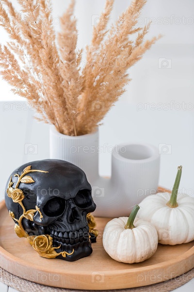 Чёрный череп с золотыми розами и тыквами на столе. Декор для Дня мертвых или Хэллоуина в интерьере кухни
