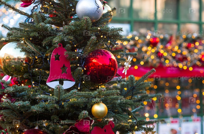 Красивый рождественский фон. Праздничные игрушки на елке в традиционных красных цветах. Концепция подготовки и украшения к Новому году. новогодняя открытка 2026