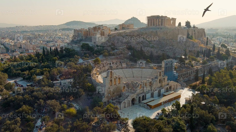 Афины, Греция.Одеон Ирода Аттика - это амфитеатр.Акрополь Афин в свете утреннего солнца.Лето, вид с воздуха