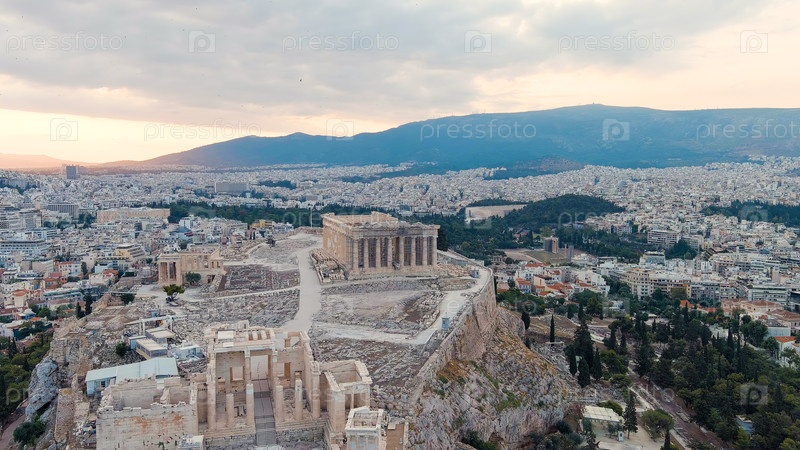 Акрополь в Афинах рано утром облачная погода лето, вид с воздуха