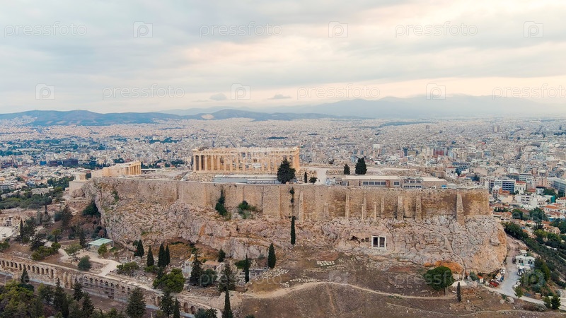 Акрополь в Афинах рано утром облачная погода лето, вид с воздуха
