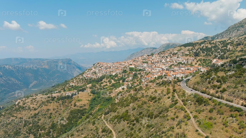 Арахова - небольшой город в Греции, в общине Дистомон-Арахов-Андикира. солнечная погода с облаками. лето, вид из воздуха