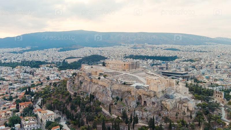 Акрополь в Афинах рано утром облачная погода лето, вид с воздуха