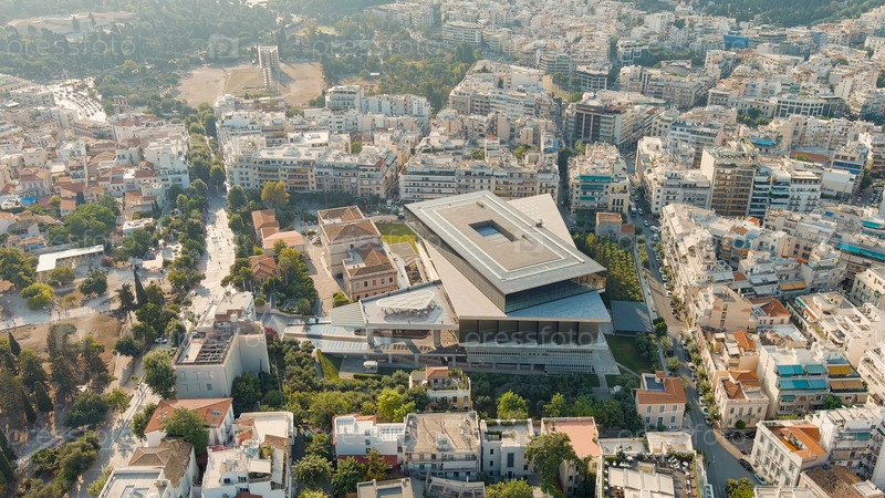 Музей Акрополя в свете утреннего солнца Лето, вид с воздуха