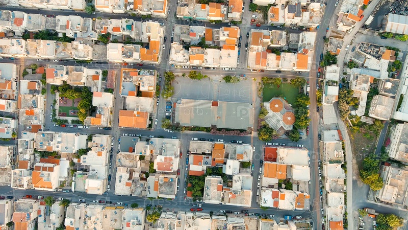 Панорама столицы во время захода солнца. крыши домов, вид с воздуха