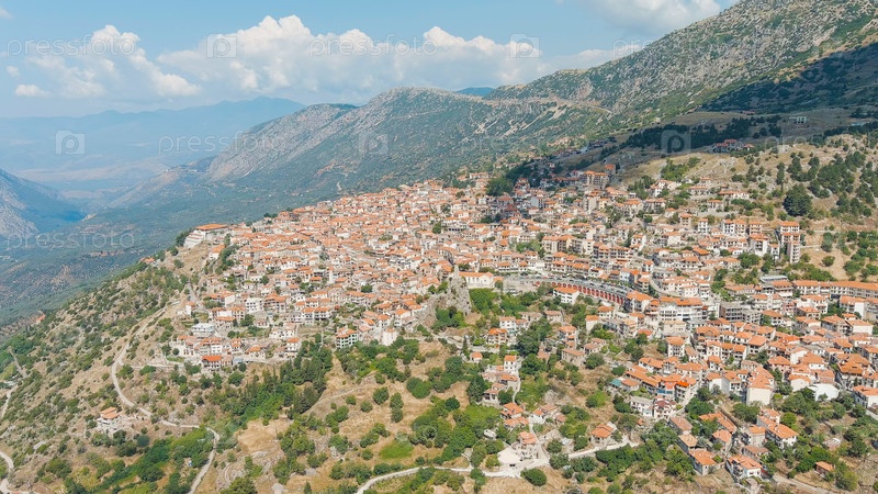 Арахова - небольшой город в Греции, в общине Дистомон-Арахов-Андикира. солнечная погода с облаками. лето, вид из воздуха