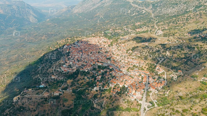 Арахова - небольшой город в Греции, в общине Дистомон-Арахов-Андикира. солнечная погода с облаками. лето, вид из воздуха