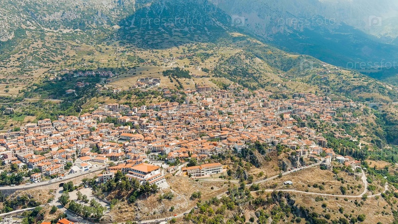 Арахова - небольшой город в Греции, в общине Дистомон-Арахов-Андикира. солнечная погода с облаками. лето, вид из воздуха