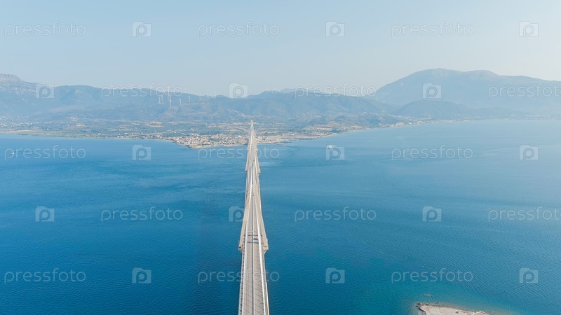 Патрас, Греция. Мост Рио-Антирио. Официально это мост Харилаос Трикупис. Мост через залив Коринф (маршрут Риона и Андриона), взгляд с воздуха