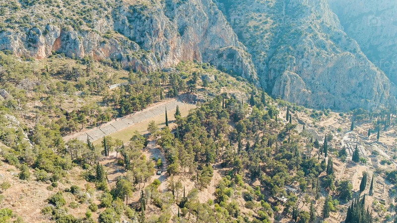 Делфи, Греция. Старый стадион Дельфов. Руины древнего города Дельфы. Солнечная погода утром, лето, вид с воздуха