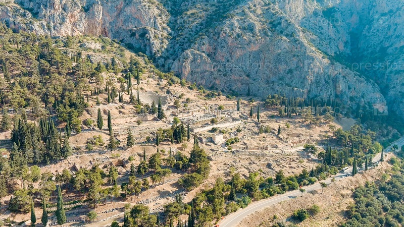 Делфи, Греция.Руины древнего города Дельфы.Солнечная погода утром, лето, вид с воздуха