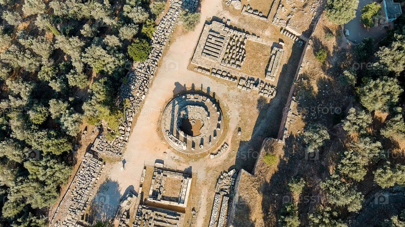 Делфи, Греция.Руины древнего города Дельфы.Солнечная погода утром, лето, вид с воздуха