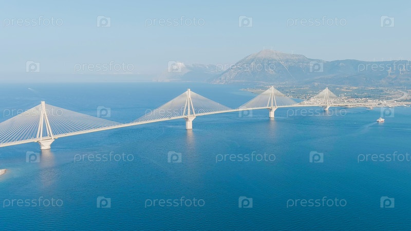 Патрас, Греция. Мост Рио-Антирио. Официально это мост Харилаос Трикупис. Мост через залив Коринф (маршрут Риона и Андриона), взгляд с воздуха