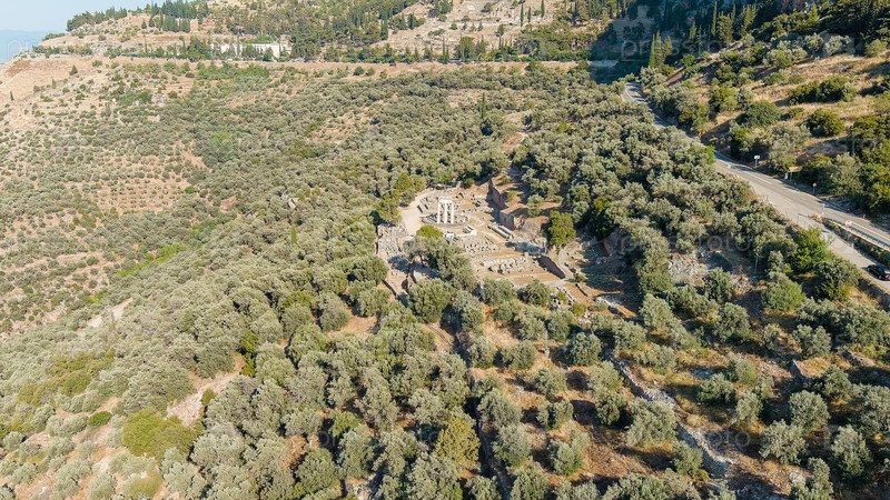 Делфи, Греция.Руины древнего города Дельфы.Солнечная погода утром, лето, вид с воздуха