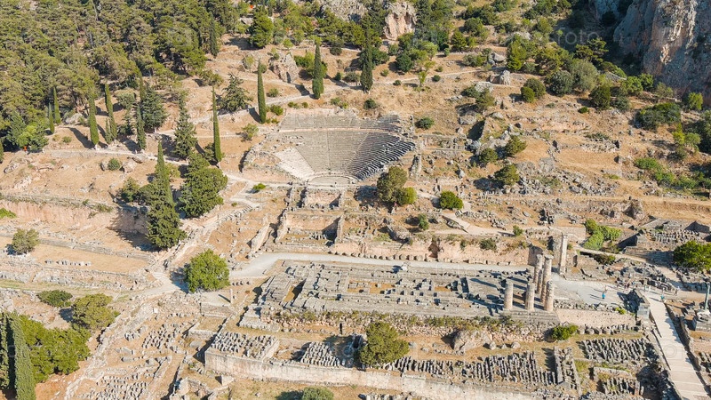 Делфи, Греция.Руины древнего города Дельфы.Солнечная погода утром, лето, вид с воздуха