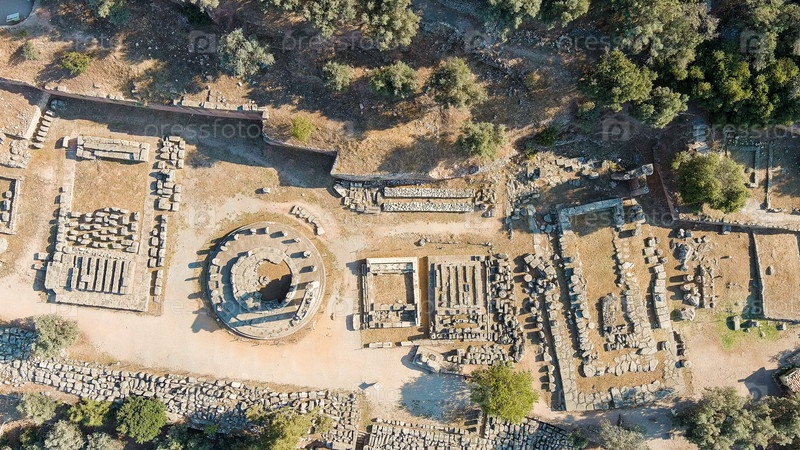 Делфи, Греция.Руины древнего города Дельфы.Солнечная погода утром, лето, вид с воздуха