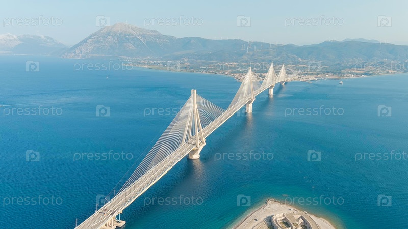 Патрас, Греция. Мост Рио-Антирио. Официально это мост Харилаос Трикупис. Мост через залив Коринф (маршрут Риона и Андриона), взгляд с воздуха