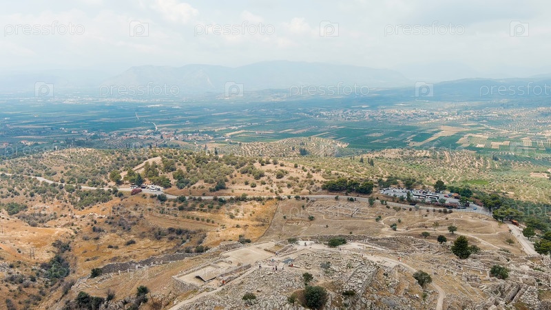Место раскопок: Греческое поселение 12-го века до н.э. с руинами акрополя, дворца и гробниц, вид из воздуха