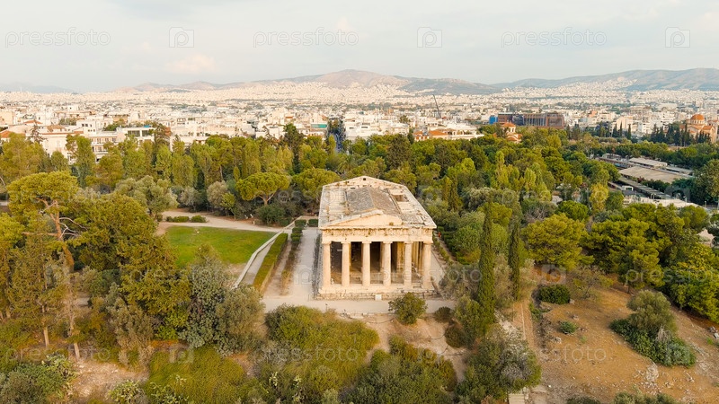 Афины, Греция. Храм Гефеста. Афинская агора в свете утреннего солнца Летом, вид с воздуха