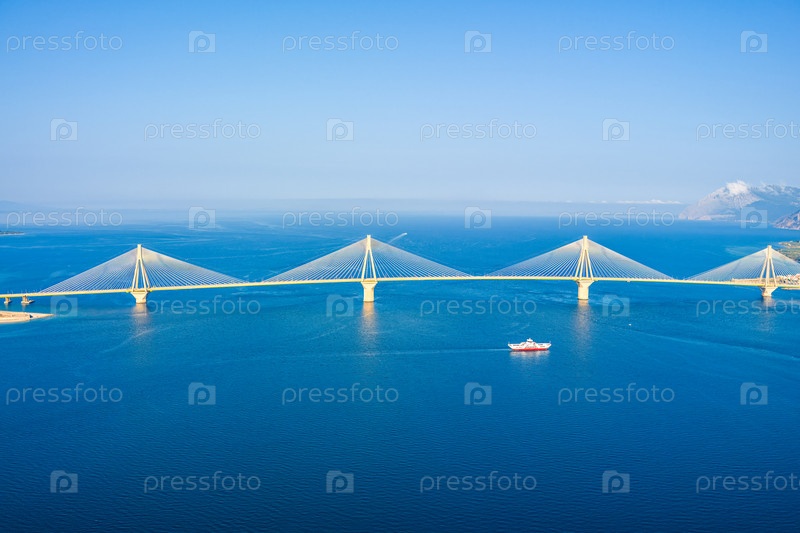 Рион, Греция.Рион - это Андрион.Дорожный и пешеходный мост через Коринфский залив.Летний день.Вид с воздуха