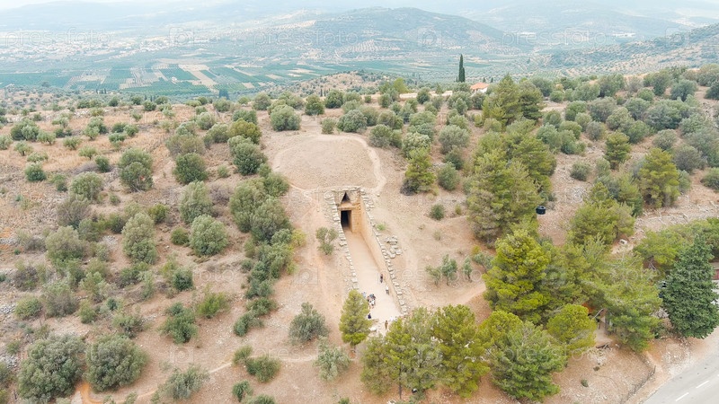 Место раскопок: Греческое поселение 12-го века до н.э. с руинами акрополя, дворца и гробниц, вид из воздуха