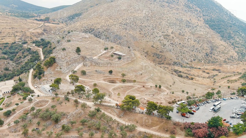 Место раскопок: Греческое поселение 12-го века до н.э. с руинами акрополя, дворца и гробниц, вид из воздуха