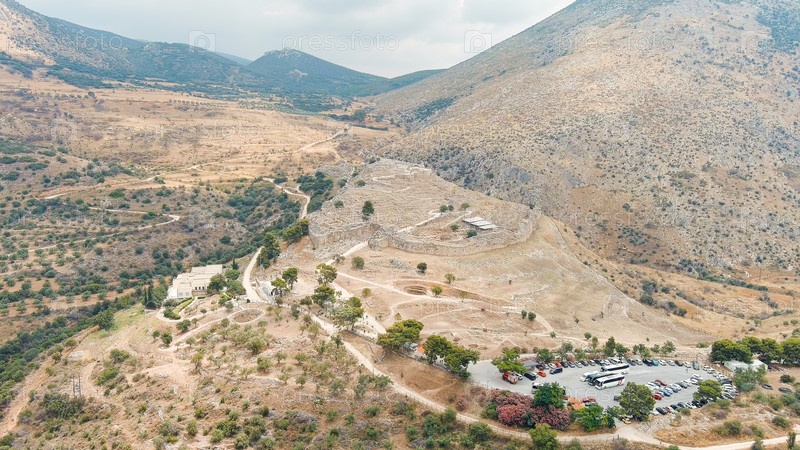 Место раскопок: Греческое поселение 12-го века до н.э. с руинами акрополя, дворца и гробниц, вид из воздуха