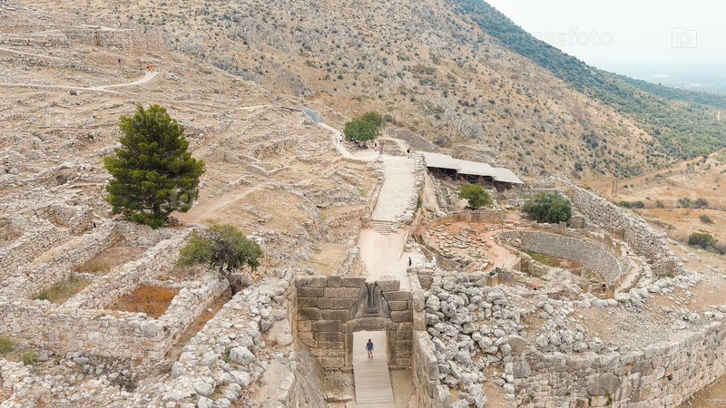 Место раскопок: Греческое поселение 12-го века до н.э. с руинами акрополя, дворца и гробниц, вид из воздуха