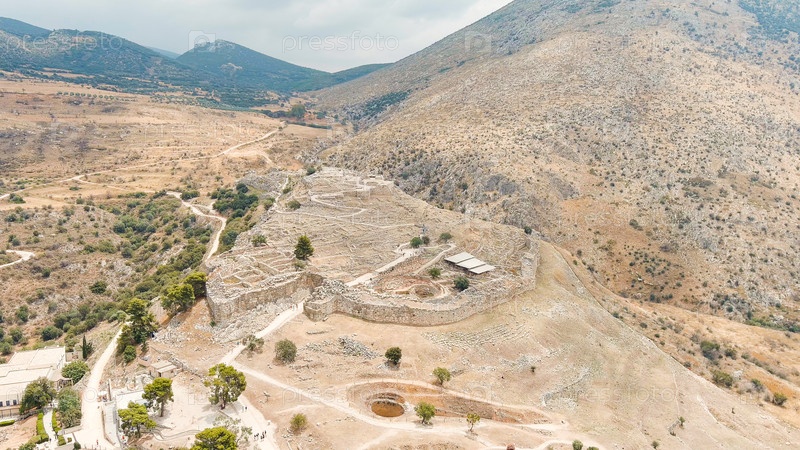 Место раскопок: Греческое поселение 12-го века до н.э. с руинами акрополя, дворца и гробниц, вид из воздуха