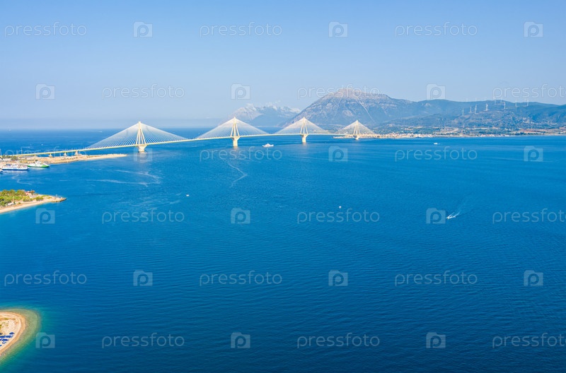 Рион, Греция.Рион - это Андрион.Дорожный и пешеходный мост через Коринфский залив.Летний день.Вид с воздуха