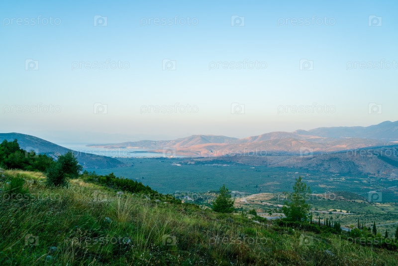Дельфы, Греция рассвет над долиной полоса света приближается северное побережье Коринфского залива бухта Итея