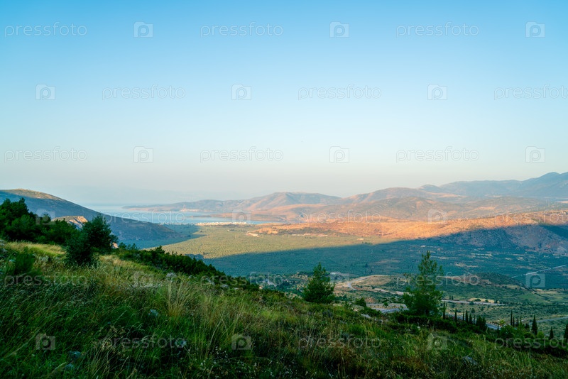 Дельфы, Греция рассвет над долиной полоса света приближается северное побережье Коринфского залива бухта Итея