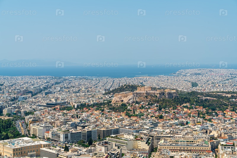 Акрополь Афин, Греция. мастер-план с видом на море и порт. руины знаменитого храмового комплекса 5 века до н.э. на скалистом холме в Афинах