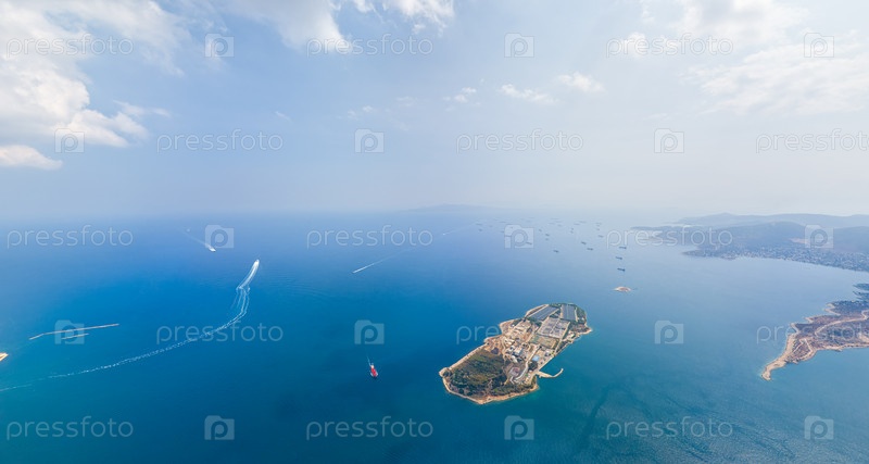 Прибрежная зона грузового порта с кораблями Лето