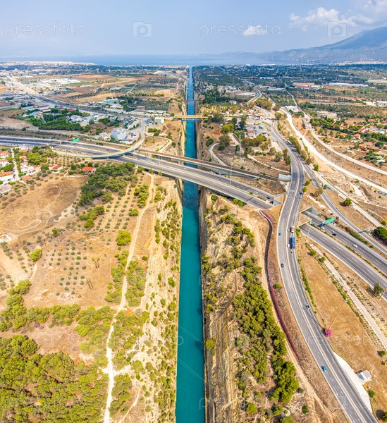 Истмия, Греция. Коринфский канал. Летний день. Облачная погода. Лето. Вид с воздуха