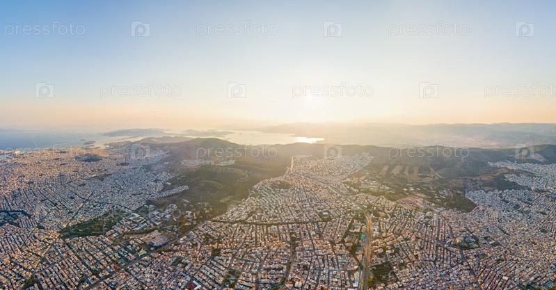 Панорама столицы Греции во время заката. Крыши домов. Вид с воздуха