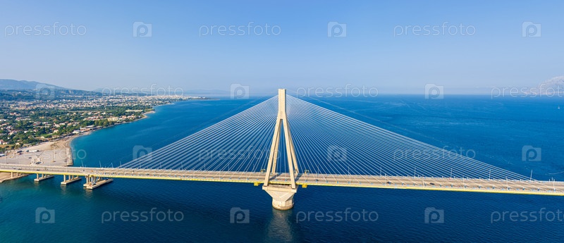 Рион, Греция.Рион - это Андрион.Дорожный и пешеходный мост через Коринфский залив.Летний день.Вид с воздуха