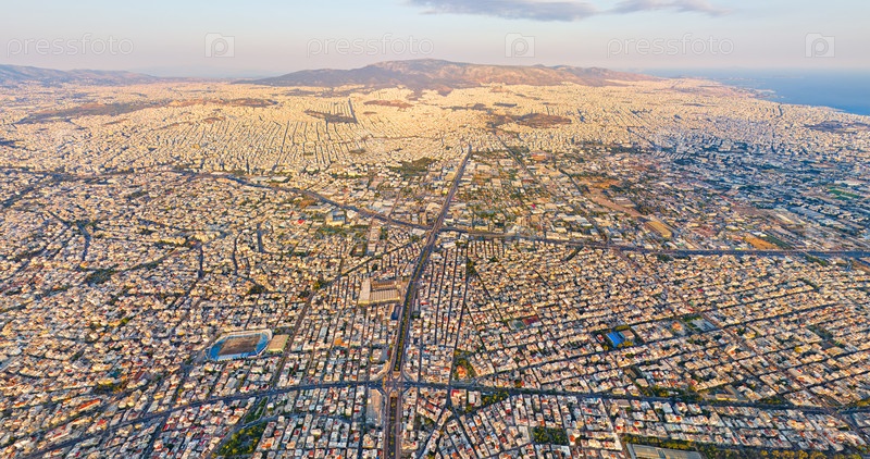 Панорама столицы Греции во время заката. Крыши домов. Вид с воздуха