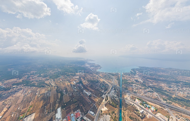 Истмия, Греция. Коринфский канал. Летний день. Облачная погода. Лето. Вид с воздуха
