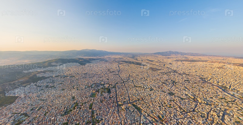 Панорама столицы Греции во время заката. Крыши домов. Вид с воздуха