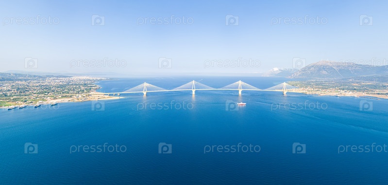 Рион, Греция.Рион - это Андрион.Дорожный и пешеходный мост через Коринфский залив.Летний день.Вид с воздуха