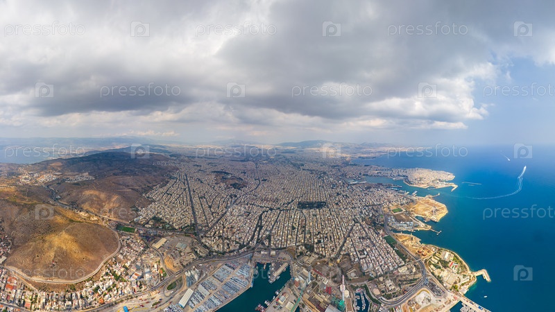 Афины, Греция. Панорама порта и города. Лето. Вид с воздуха