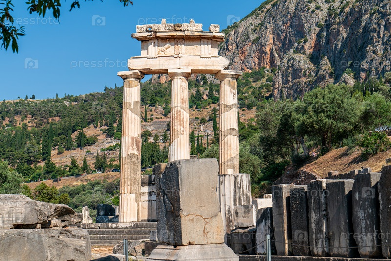 Дельфы, Греция. Толос Афина Пронаяя. Руины древнего города. Летний день