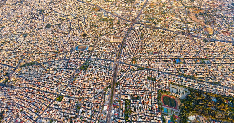 Панорама столицы Греции во время заката. Крыши домов. Вид с воздуха