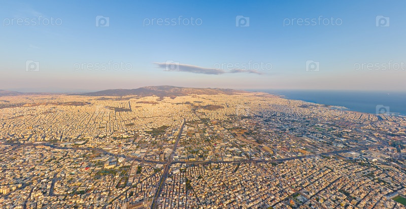 Панорама столицы Греции во время заката. Крыши домов. Вид с воздуха