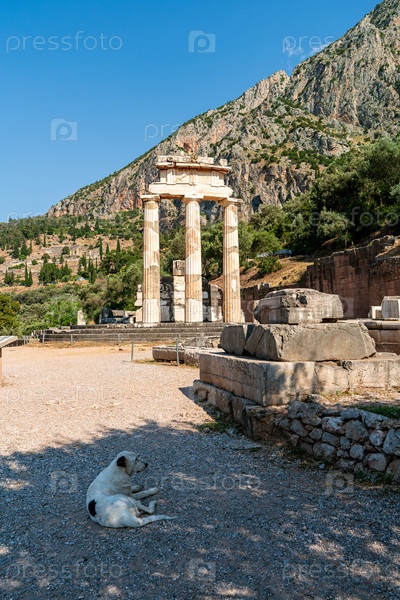 Дельфы, Греция. Толос Афина Пронаяя. Руины древнего города. Летний день