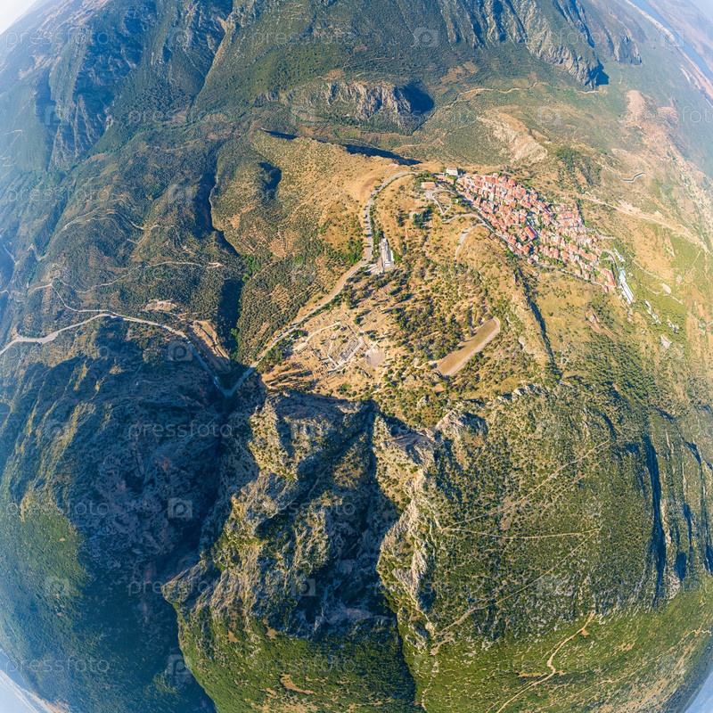 Делфы, Греция. Руины древнего города Дельфи и современный город. Вид на долину. Солнечная погода, летнее утро. Вид с воздуха