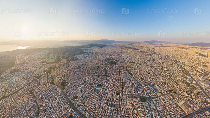 Панорама столицы Греции во время заката. Крыши домов. Вид с воздуха