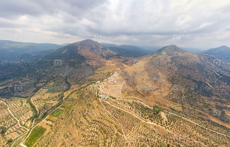 Микены, Греция.Микены - место раскопок.Греческое поселение 12 века до нашей эры с руинами акрополя, дворца и гробниц.Летний день.Облачная погода.Лето.Вид с воздуха