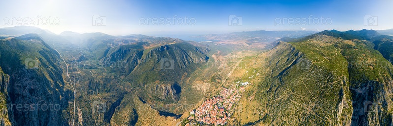 Делфи, Греция. Современный город. Вид на долину. Солнечная погода, летнее утро. Панорама 360